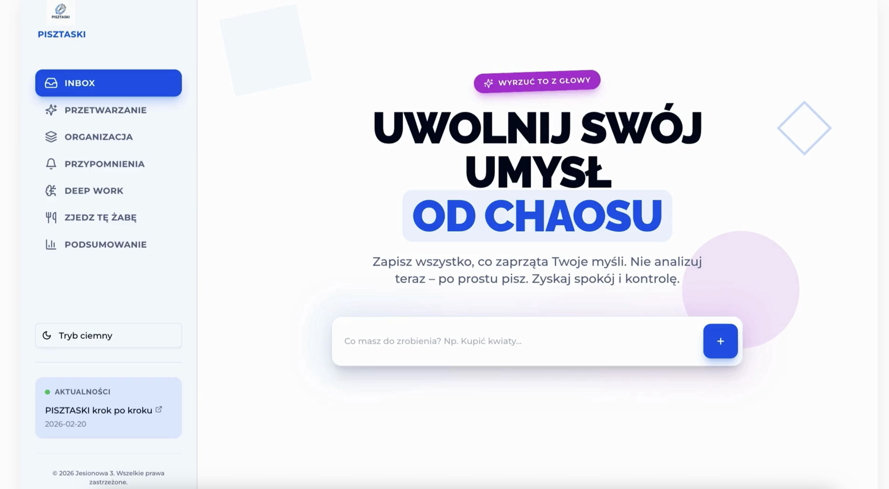 Aplikacja Pisztaski - Twoje centrum dowodzenia. Czyści umysł z natłoku myśli, porządkuje priorytety i prowadzi przez Deep Work.